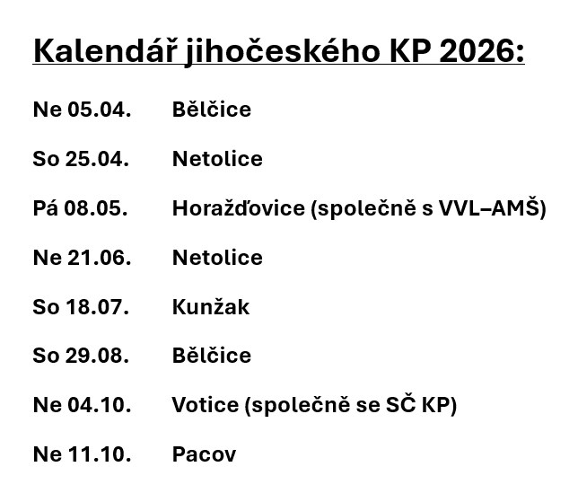 Vážení příznivci jihočeského motokrosu! Připravili jsme pro Vás kalendář Jihočeského KP v motokrosu pro rok 2026. Čekali jsme na kalendáře OMČR Senior a OMČR Junior, abychom se pochopitelně těmto závodům vyhnuli. No a pak jsme dali hlavy dohromady s vedoucím Středočeského KP Mírou Burešem, abychom se v termínech nekryli ani spolu, zohlednili jsme i závody MXGP v Lokti a MS Junior v Jiníně a předběžný kalendář JČ KP 2026 již po dohodě s pořadateli a s časomírou vypadá takto: