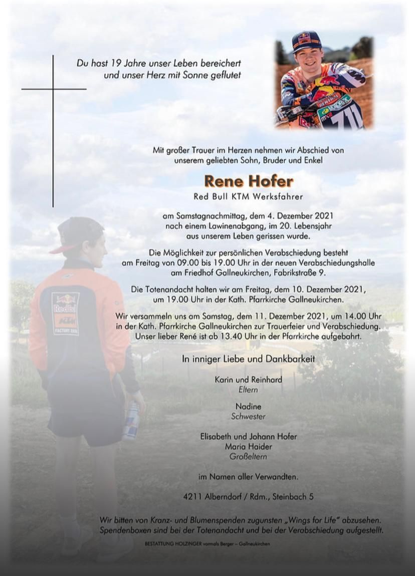 V sobotu, 4. prosince smetla lavina část jedenáctičlenné výpravy, jejímž členem byl i Rene Hofer. Společně se dvěma dalšími kamarády motokrosaři toto neštěstí bohužel nepřežil. Stalo se tak kolem 13:45 ve výšce asi 2400 metrů těsně pod vrcholem na severovýchodním svahu rakouské hory Lackenspitze, vysoké téměř 2500 metrů, nacházející se zhruba na půl cesty mezi Salzburgem a Villachem. Při výstupu skupiny skialpinistů smetla velká vrstva sněhu o šířce 200 metrů a délce 500 metrů celkem osm lyžařů. Tři mladí lidé bohužel našli svou smrt 4,5 metru pod sněhem. Mezi nimi Rene Hofer a další čtyřiadvacetiletý mladý muž. Další, devatenáctiletý mladík byl oživen a vážně zraněn převezen vrtulníkem do nemocnice v Klagenfurtu, kde bohužel zraněním také podlehl. Záchranné akce se účastnilo celkem 120 záchranářů, zástupců policie, Červeného kříže a sboru dobrovolných hasičů. Lyžařská túra na Lackenspitze vyžaduje podle horské služby stabilní podmínky. Silný vítr však pravděpodobně způsobil nahromadění sněhových závějí, které se bohužel uvolnily a staly se tak Rene Hoferovi a jeho dvěma kamarádům osudnými… Nikdy nezapomeneme!
