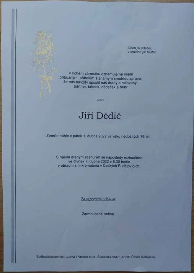 Bohužel musíme oznámit další smutnou zprávu. v pátek, 1.4.2022 zemřel ve věku nedožitých 76 letech Jiří Dědič, kterého každý znal především jako fotografa na motokrosových závodech nejen v jižních Čechách jako Dědu T.